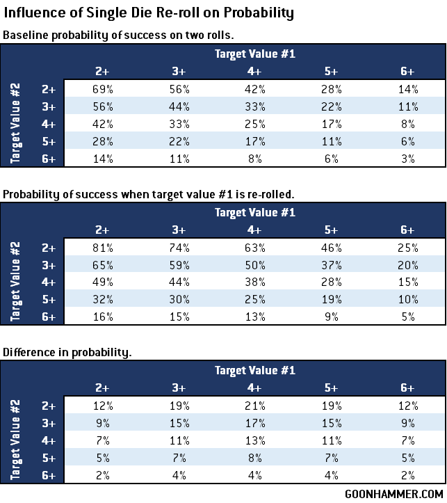 Wreckaz for 2 CP to add 1 to the wound roll. The effect of the re-roll is dependent on two factors; the number of attacks and the probability of success for the roll. The more attacks that are inflicted, the less influence a single-reroll will have on the outcome. With respect to probability, the influence of a re-roll depends on both the chance that the re-roll will be needed and the probability that the re-roll will succeed. The formula is below, where P(X) is the probability of success for the roll.