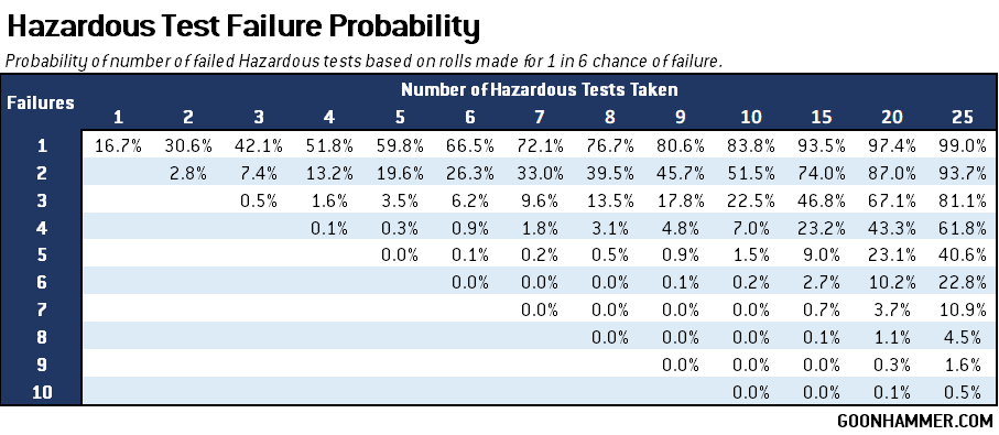 The Hazardous test is a pretty simple effect. When a model makes an attack with a weapon with the [HAZARDOUS] trait, it then has to take a Hazardous test. On a roll of a 1 (or 2 now), INFANTRY units lose a model while CHARACTER, VEHICLE, and MONSTER units take 3 mortal wounds. Multiple attacks with multiple weapons produce multiple tests, such as when a Leman Russ Executioner overcharges all of its plasma weapons. As one would expect, more tests means more potential for failure. To calculate the probability we calculate the binomial probability that a given number of failures will occur over a given number of trials. The table below shows the results.
