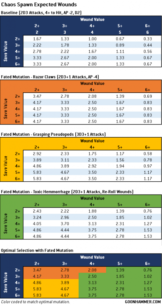 absurdly cheap Fast Attack units which exist solely to run into things are murder them. At 23 points these T5 critters with four wounds get 2D3 attacks at S5, AP -2, and D2. They have three mutations. Razor Claws changes their melee attack to AP -4. Grasping Pseudopods changes their attacks from 2D3 to 3D3. Toxic Hemmorhage allows them to re-roll failed wounds. Because we're dealing with a wide range of save and wound targets the easiest approach is to calculate the expected wounds for each combination and see which solution is optimal. The results below assume that you're using the Stratagem to induce an effect and therefore will also gain an extra attack. We quickly see that all three effects have their place. The razor claws are most useful against targets of T5 or lower with saves of 2+ or 3+, the grasping pseudopods more effective targets of T5 or lower with higher saves, and the toxic hemorrhage is preferable against the tougher stuff.