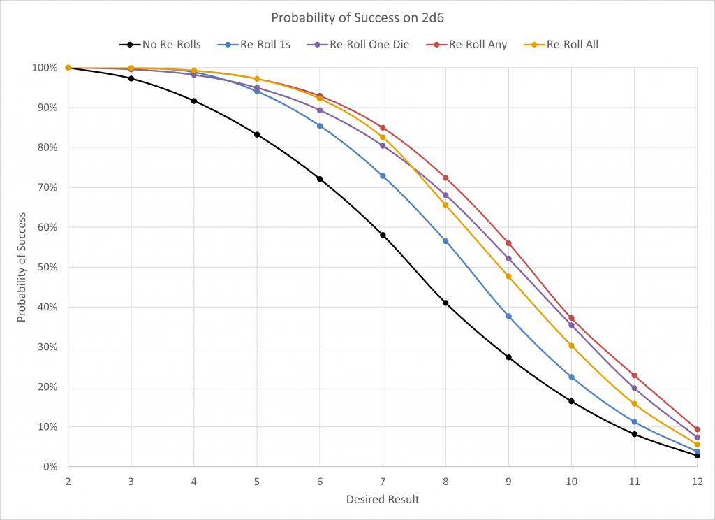 dice, not roll, meaning that it is identical to the 8th Edition CP re-roll and is much more powerful. You can see the effect below in the difference between the re-roll one die and re-roll all lines; the same is also true of charge rolls.