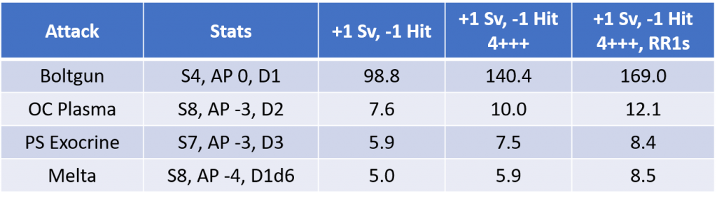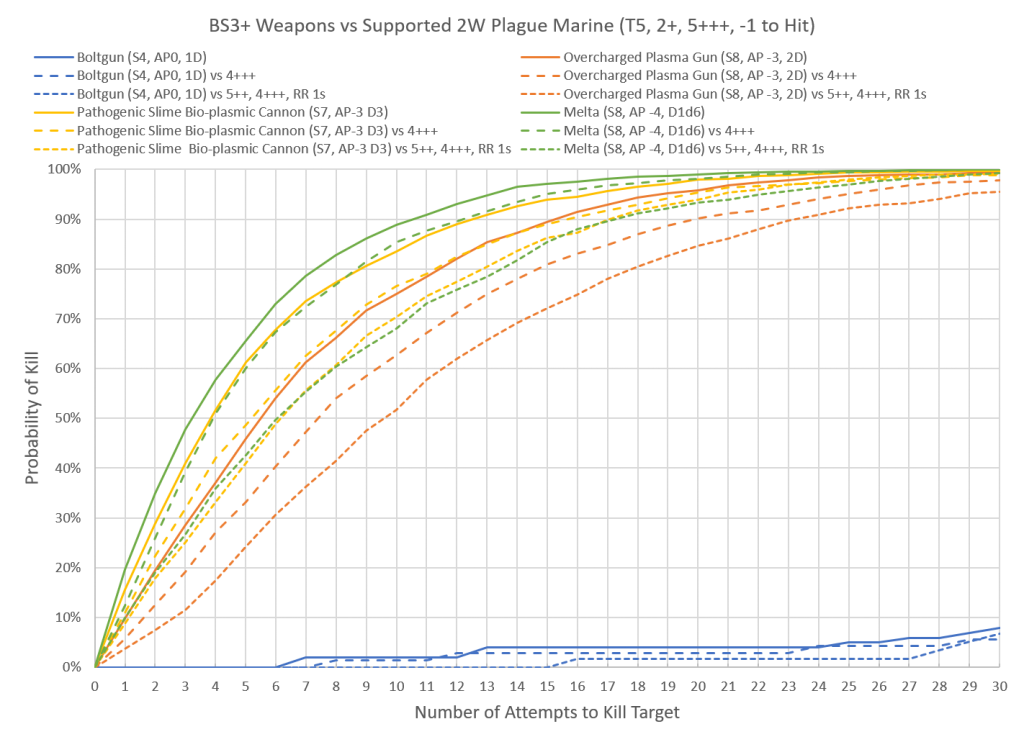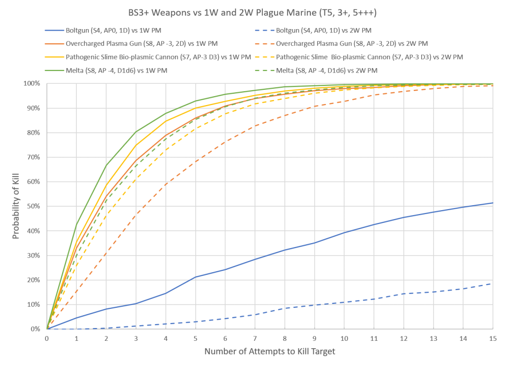 This means that a 6+++ provides a 120% increase to the number of wounds, a 5+++ is effective 150% more wounds, and in the event of a 4+++ the wounds of the model are effectively doubled. You can also incorporate the possibility of re-rolls. For example a 5+++ with the option to re-roll results of 1 has a probability of success of 39% instead of 33%; apply the formula above and the resulting effective wounds jumps from 150% to 164%. In the context of Plague Marines this means that when the new rules drop Plague Marines will effectively have 3 wounds instead of 2. How will this change look against various attacks?