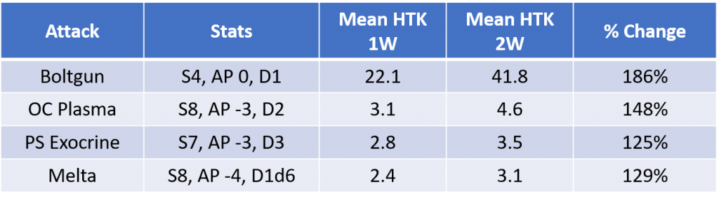 For the chart above 10,000 attacks were simulated and then attacks were counted until the target died. In scenarios where a large number of attacks are required to kill a target (like in the case of the boltgun) this results in a wavy line that's not a perfect reference, but for the purpose of our scenario it should be fine. The bottom line is that a weapon on the scale of the humble boltgun had a 5% chance of dealing a single wound to a Plague Marine; double the wounds and now the chance of two bolter shots killing the target is 0.3%. Other weapons traditionally known for killing Primaris like overcharged plasma, the bio-plasmic cannon of the Exocrine (in this case boosted with