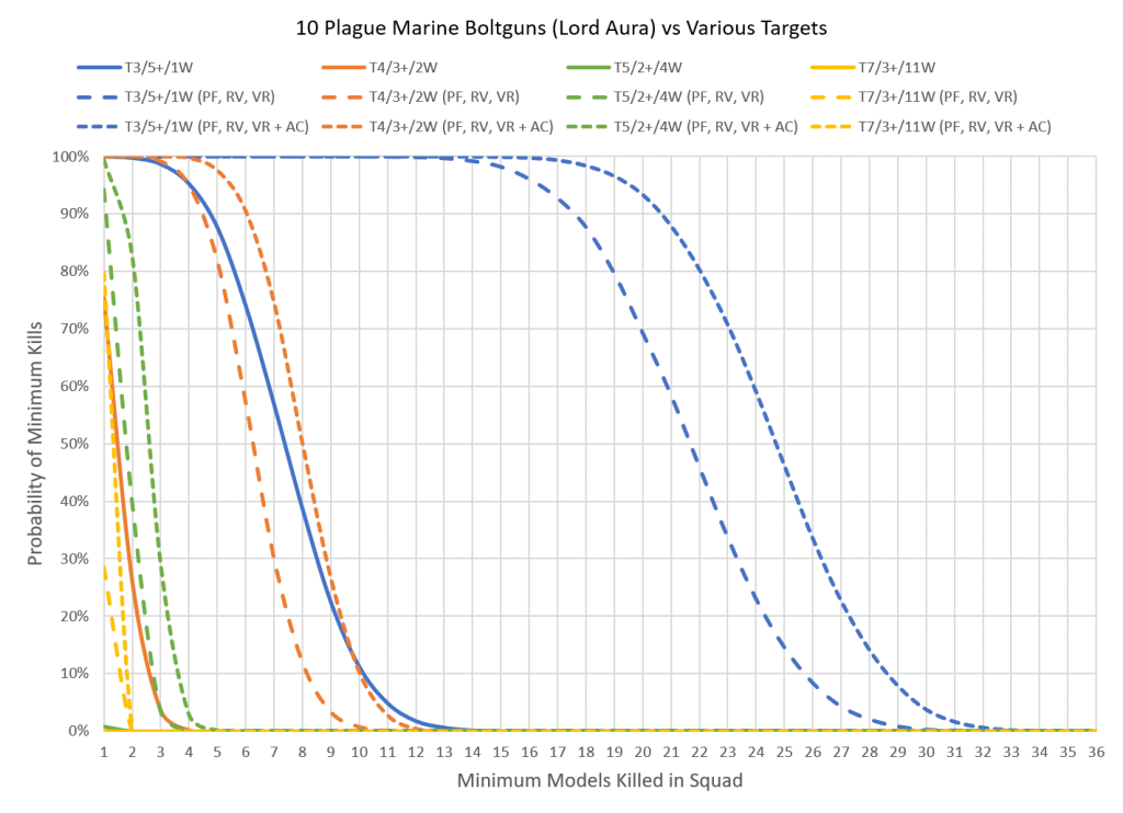 Plague Marines aren't just hard to kill; while known for a solid choice of special ranged and melee weapons, the War of the Spider has provided them a healthy selection of stratagems and auras that make even their lowly boltguns a substantial threat to many different targets. The chart below shows four different targets ranging from a Guardsman equivalent to a typical T7/3+ tank profile. The lines assume the presence of a re-roll aura from a Chaos Lord (or Lord of Contagion with