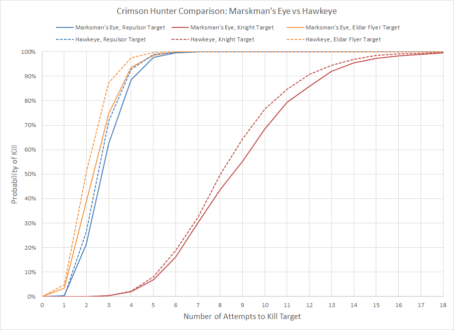 In the graph above each color represents a different target, and the dashed line and solid line are different abilities. The further to the left a curve is the better, indicating that the unit is able to kill the target faster. We already know that modifiers are better than single die re-rolls, and nothing changes here. Under the rules of 8th Edition getting a +1 to hit will always be better than re-rolling values of 1, and since Crimson Hunters will always be moving choosing Hawkeye is the superior choice.