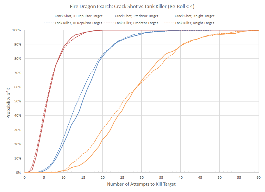 With the prevalence of Repulsors (especially Iron Hands) and flyers in the current competitive meta it may be worth locking in the choice of Aerial Predator. Although this reduces your effectiveness against ground targets, the +1 damage bonus is superior to even Hawkeye. I also added two curves showing the benefits of adding a re-roll hit of 1 effect such as from an Autarch; in a re-roll bubble two Crimson Hunter Exarchs have a roughly 50% chance of killing an Iron Hands Repulsor if they have Aerial Predator.