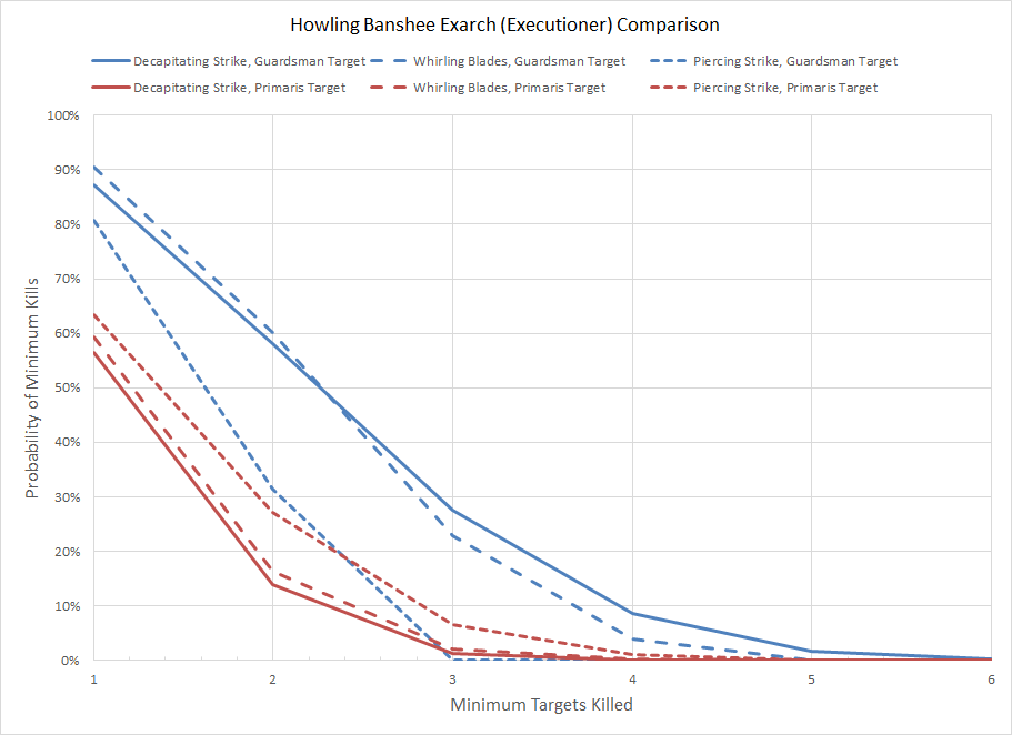 The bottom line is that from a mathematical standpoint Avenging Strikes has a 54% greater output than Bladestorm, but with the caveat that you must lose a model before this occurs. Depending on the size of the unit and the threat Avenging Strikes may never be used as the unit could be wiped out (particularly a concern for smaller units). The circumstances revolving around which option is ultimately superior depends on your style of play, the threats encountered, and the size of the unit. A larger unit which is able to withstand casualties is a more appropriate choice for Avenging Strikes, but a 54% output is significant. As is the case with all modifiers any situation with a lower P(Wound) or lower P(Save) is going to see that effect improve even further.