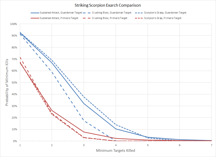 Against infantry targets the difference is fairly minor. Scorpion's Grasp provides the potential to kill more Guardsman and has a slightly improved chance to kill the first Primaris, but generally overlaps with Sustained Attack. Crushing Blow performed equivalently to Scorpion's Grasp against Primaris targets and was overkill against Guardsman targets, but as noted in the review the S10 provided by Crushing Blow makes it more useful against higher toughness threats.