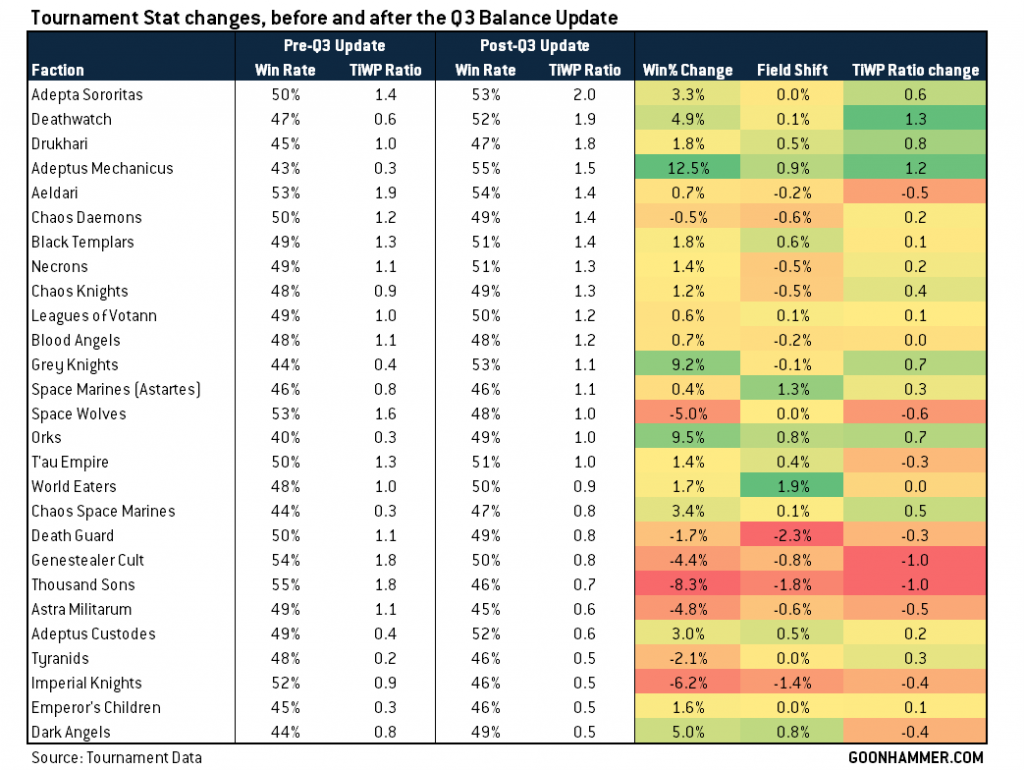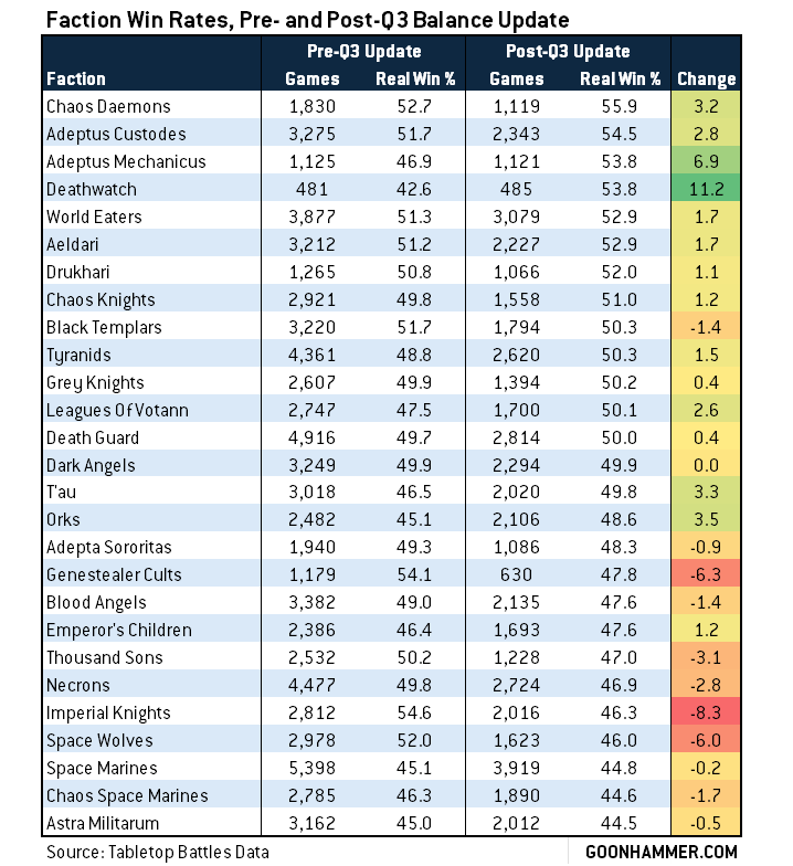 Some of the big winners here were easy to see coming: The Adeptus Mechanicus and Deathwatch in particular got big buffs in the Q3 update, and we similarly saw solid improvements for Chaos Daemons (though it was argued "not enough" at the time), T'au Empire, and Orks. The big losers are more or less what we expected - Genestealer Cults, Imperial Knights, Thousand Sons, and Space Wolves all took substantial hits, while Chaos Knights and Death Guard more or less held firm, having already received their nerfs a month earlier and seeing only small changes in the balance update.