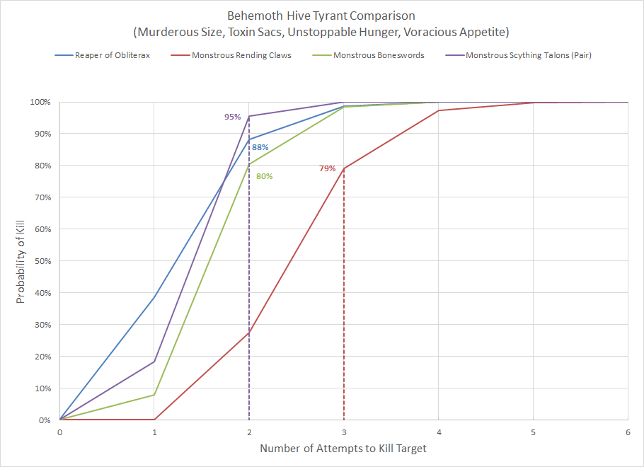 Note that these curves are different from last week's because they also include the use of Voracious Appetite and the Toxin Sacs. What's interesting is that while on average the Reaper of Obliterax attack did more wounds (19.9 wounds versus 17.8 for the pair of monstrous scything talons), the Reaper of Obliterax was far more spread out with nearly twice the standard deviation (9.3 for the Reaper, 5.0 for the talons). The Reaper was able to one-shot a Knight nearly 40% of the time, whereas the pair of monstrous scything talons had roughly half the success rate. The talons were more reliable in the long run, but the Reaper can absolutely put out an insane amount of damage. It's definitely worth considering.