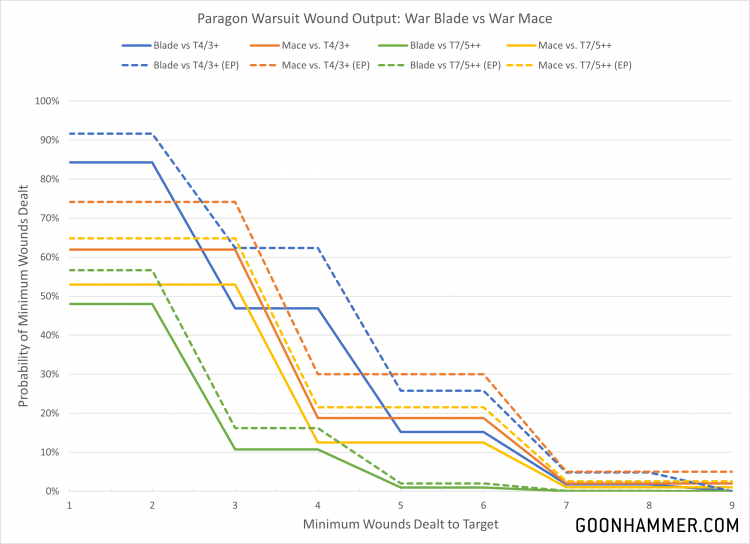 Regarding Paragon Warsuit melee weapons, could you do a comparison between the options against different kinds of targets? I’m leaning toward a mostly sword build because the extra attack seems more useful than the higher strength with hit penalty, but would like math to help me decide. Thanks.The Paragon Warsuit hails from the 'armored baby carrier' school of the Adeptus Mechanicus, and in addition to an assortment of horde or tank killing ranged firepower they're also given the option of taking a Paragon war blade (4 attacks at WS 3+, S6, AP -3, D2) or Paragon war mace (3 attacks at WS 4+, S9, AP -2, D3). They have the option to use Exceptional Proficiency (1 CP) to add 1 to an attack role, so we can also look at that. Because the Strength values are so odd there's a lot of overlap over the typical forces; T4 and T5 have the same wound rolls, as does T7 and T8. From the chart below we see that the blade and mace have comparable outputs, but in the end it depends on the target. For a 2W model that needs a 3+ to wound the blade is superior, but if the target has 3 wounds or a higher toughness then the mace is a better choice even with the hit penalty. Personally I'm on Team Mace.