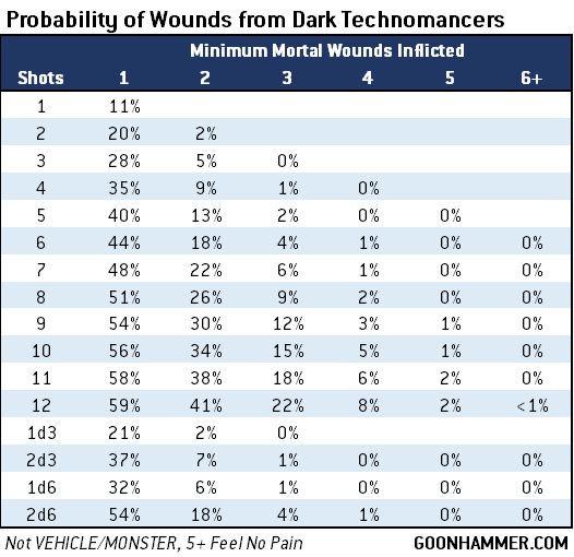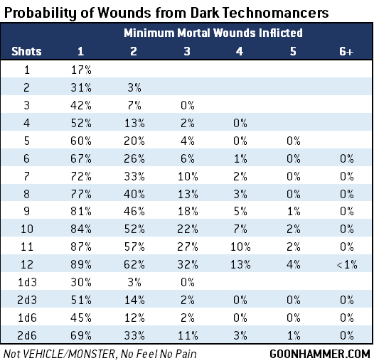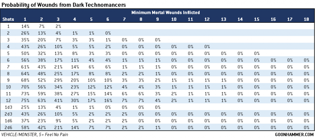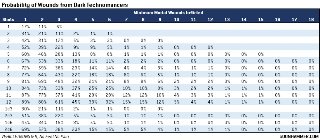 Hi Kevin, while you have covered Drukhari and Raiders in particular repeatedly recently, as an aspiring Haemonculus who doesn't mind inflicting a bit of pain for some gain on my own forces, I was wondering if you could revisit and expand on some of the maths around Dark Technomancer ability to boost weapons? In particular the damage output of over charged Disintergrator cannons vs Dark Lance's on Raiders and the potential lunacy of over charging on platforms such as Venoms, Talos, Reapers, and Tantalus?Particularly masochistic Haemonculi have the choice of joining a Coven with the Dark Technomancers Obsession. When shooting with something other than a liquifier gun the player can choose to enhance the attack, gaining +1 to wound and +1 to Damage but at the expense of causing the unit to take 1 mortal wound for each unmodified hit roll result of 1 (and hit rolls can't be re-rolled). VEHICLE or MONSTER units get it even worse, with each 1 inflicting D3 mortal wounds. There are a lot of factors at play which will decide how effective each weapon is against various targets.