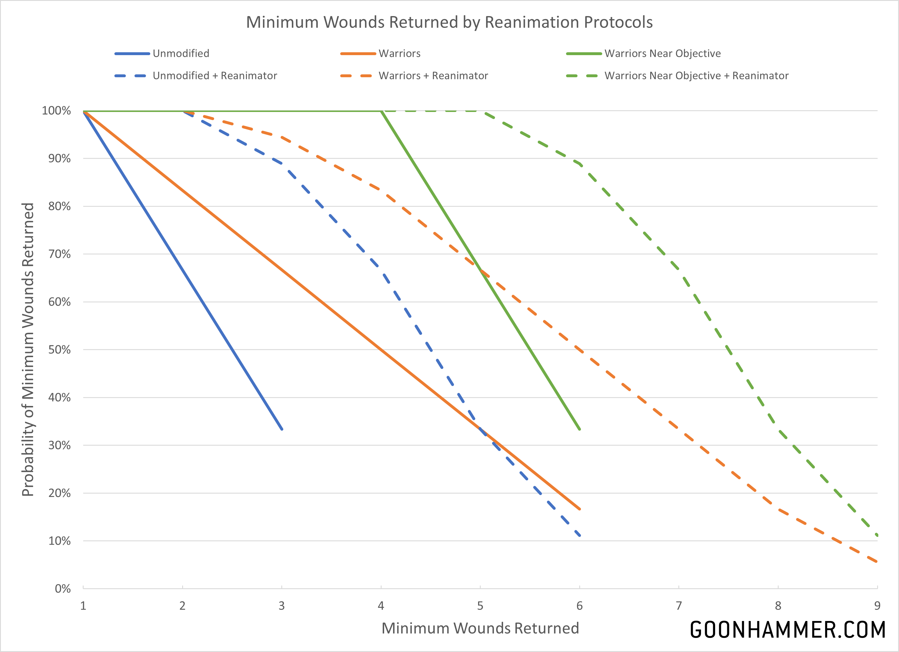 Where things get really interesting is when you consider that units have the possibility to apply multiple activations of Reanimation Protocols in between subsequent rounds. At the very least a unit with a nearby Catacomb Command Barge or embedded Lord / Overlord with a Resurrection Orb is going to activate their protocols twice (once at the end of each Command phase). The presence of a nearby Ghost Ark can add a third activation to a Necron Warriors unit, and of course there's the Protocols of the Undying Legion Stratagem.