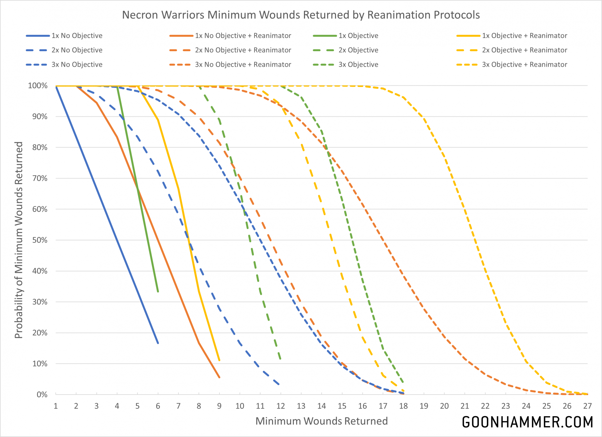 This chart really shows the synergistic effect of combining units with multiple activations. The addition of a 65 point Lord with a Resurrection Orb to a unit of Necron Warriors averages between 8 and 15 wounds returned depending on the proximity of an objective marker and Canoptek Reanimator, and even a unit with 19 models destroyed has a 90% chance of being fully restored if it's in the right location with three activations.