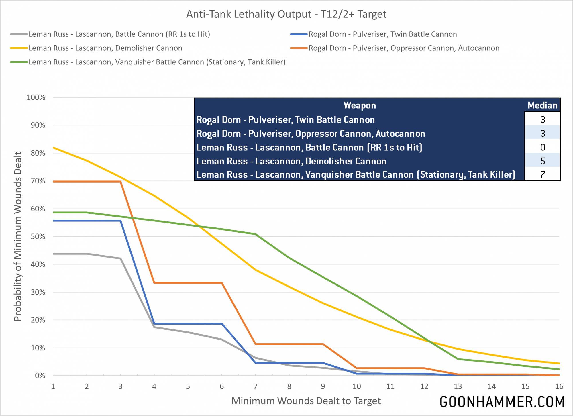 So how well does this work against a heavy T12/2+ target like the Rogal Dorn itself? The chart below shows the wound curve of the two Rogal Dorn options against the various Leman Russ main weapons. Note that this does not include the side sponsons, but it does include the lascannon that every Leman Russ is likely to take. The results show that the Dorn is decidedly okay against heavy targets, but it's still a bit below the raw power of the Demolisher or the high variance (and high potential) of the Vanquisher. It's noteworthy that a heavy portion of the variance of the Vanquisher is due to the single shot, meaning that it benefits considerably from the Hit Roll bonus from the Take Aim! order.