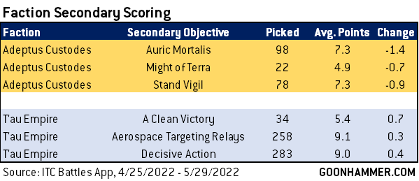 While there haven't been enough GSC or Black Templar games to really dig into their secondaries post-dataslate, there are enough Custodes and T'au games to talk about those factions and how they've shifted since march. In particular, the Custodes have seen substantial (though directional) drops to their faction secondary scoring, particularly Auric Mortalis - again, they've gotten slightly worse at surviving and their opponents slightly tougher. Scoring also dropped for Stand Vigil, which again makes sense in the context of the faction losing ObSec on a number of units.