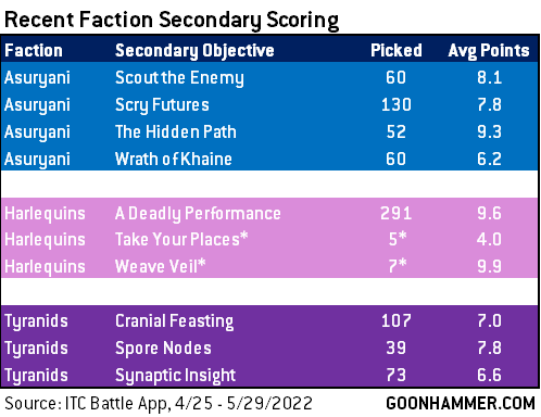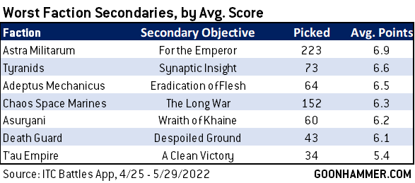 So if those are the top picks, what are the "traps," i.e. the faction secondaries that people take but consistently yield subpar results? Well, let's look at the secondary objectives that players take often, but which average fewer than 7 points per game.