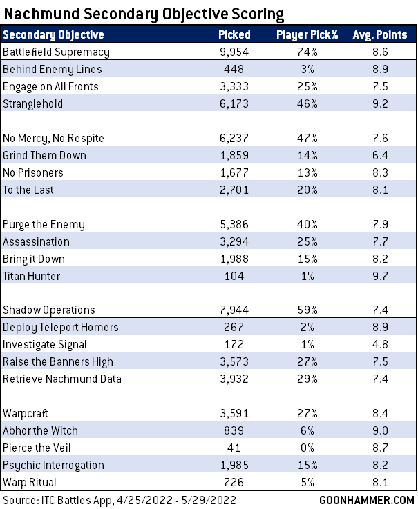 Let's start with the standard secondary objectives from the War Zone Nachmund: Grand Tournament Missions book. We had ample data to look at the secondaries last time around but now we can refine our look and just take the last month of data, starting from games happening after the April balance dataslate. At this point we've got just under 6,700 games worth of data in the sample, giving us a pretty solid look at how these secondary objectives have played out.