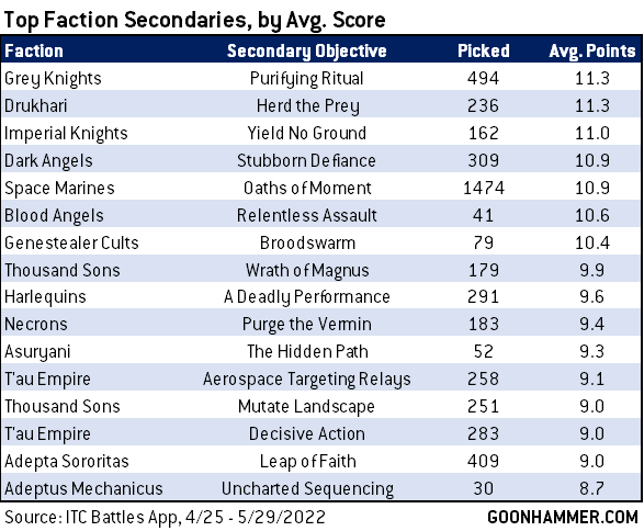 Yield No Ground, which was already showing up in our March analysis as a top secondary objective (avg: 10.4) and will likely continue to be among the game's top secondaries now that Knights have a new Codex. The challenge remains that as a Battlefield Supremacy pick, it's not providing quite as much excess value as Purifying Ritual.