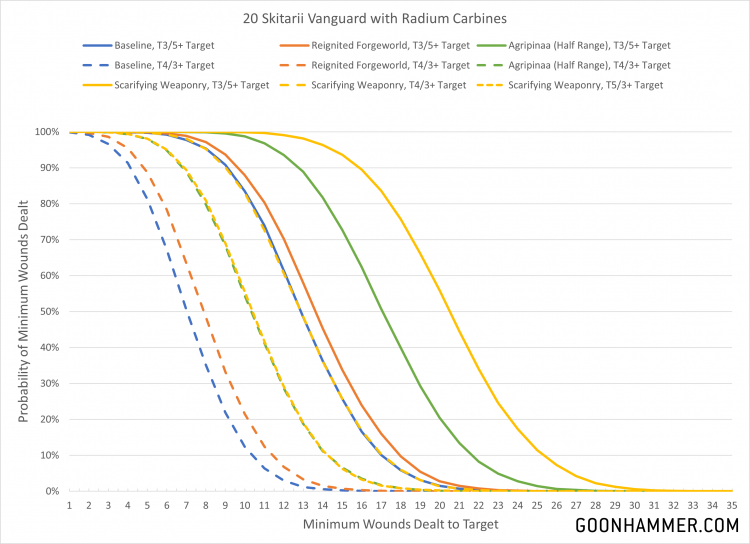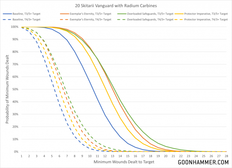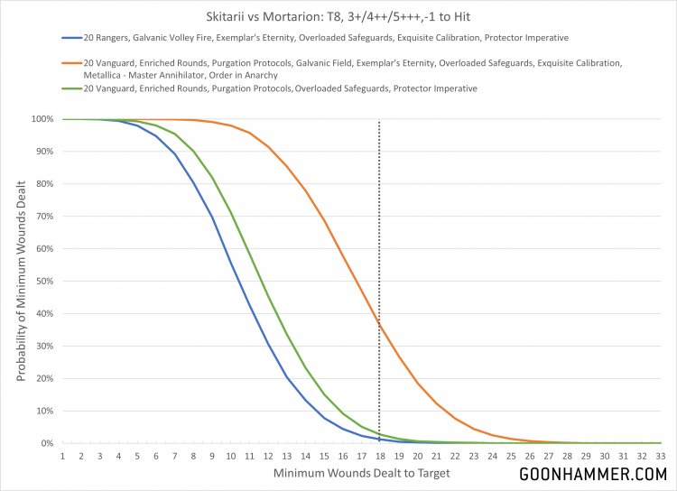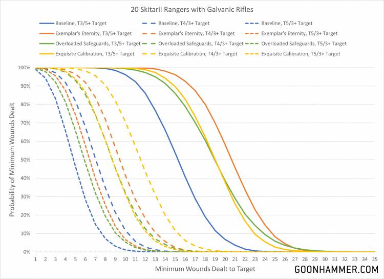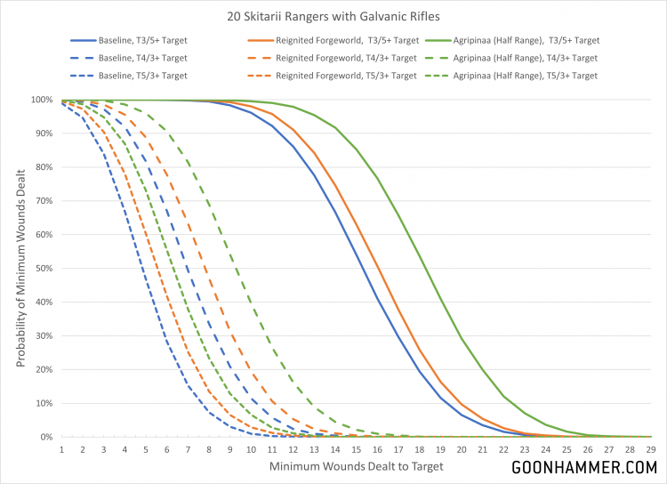 Miasma of Pestilence is almost certain to be active to impose a -1 to hit penalty as well. So with that in mind, how much damage can 160 points worth of cyborg warriors do the epitome of the Emperor's genius and favored son of the Plague God himself? Well for this we'll look at three scenarios. The first is the best possible configuration for Rangers, with 20 galvanic rifles firing 80 shots at S5 with hit and wound rolls of 1 being re-rolled and every unmodified hit roll of 6 generating an extra attack. The second applies every possible bonus to 20 radium carbines, with 60 shots at S5 and AP -1 getting the same extra hits AND automatically wounding on a hit roll of 4 or higher. The final curve is a slightly more sane combination that might be seen on a Lucius unit where a Tech Priest Manipulus applies