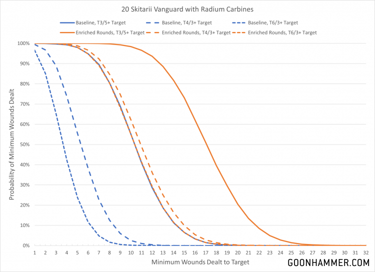 Enriched Rounds, with targets that force a 4+, 5+, and 6+ wound roll. This ability has a huge impact against any kind of large MONSTER or other tough non-VEHICLE unit. Going from an attack which has to hit and then roll a 6 to wound to 50% of your attacks bypassing the wound roll entirely is incredible.
