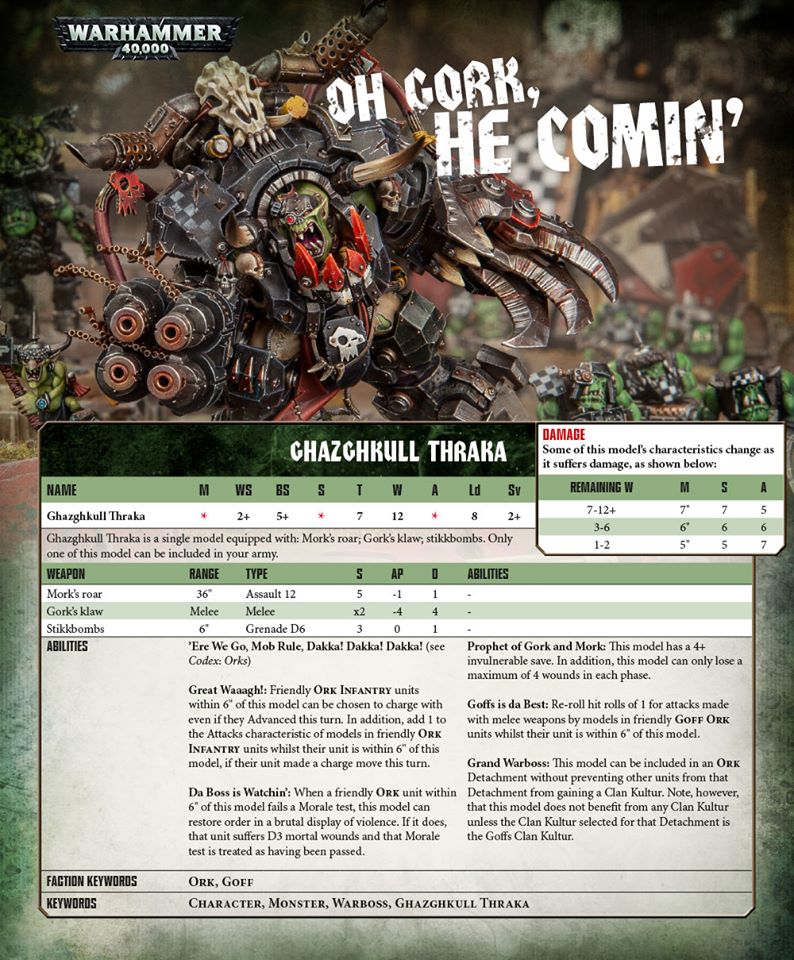 Prophet of Gork and Mork rule Ghaz completely puts that on end; it doesn't matter how much damage a Knight Dominus or Smash Captain can deal when everything past four wounds is completely disregarded. Dealing those wounds to Ghaz isn't exactly trivial either thanks to the combination of high Toughness characteristic, armor save, invulnerable save, and Feel No Pain when Makari is within 3" and applies