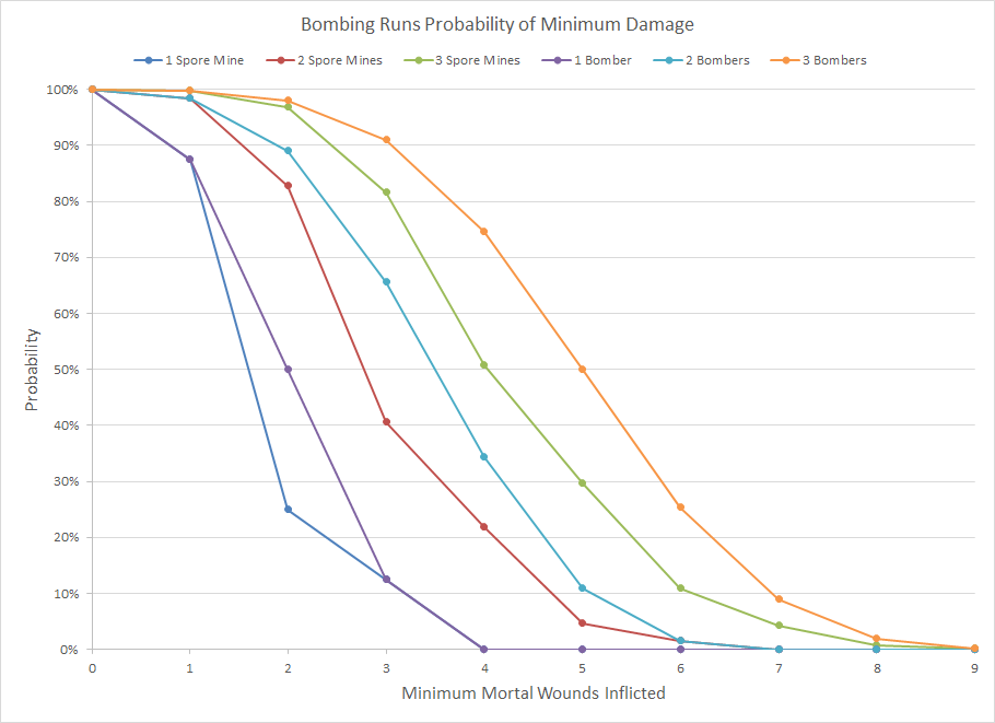 Hive Commander ability to force a Harpy to move again and do another bombing run. This provides the additional pass required to achieve an 82% probability of inflicting enough mortal wounds, and based on the rules and the FAQ it seems like the attack would occur in the Movement phase. The effects are similar in the Charge phase, with most abilities inflicting a mortal wound on a particular die roll. To have an 80% or greater chance of dealing 4 mortal wounds with these abilities you would need at least 3 Mucolid Spores, 4 Spore Mines, 10 dice if a mortal wound is dealt on a 4+, 16 dice if a mortal wound is dealt on a 5+, and don't even bother if you need a 6+.
