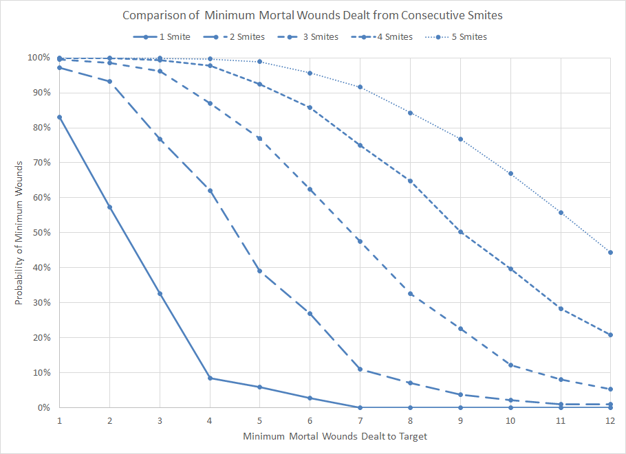 Smite alternatives are inferior and there are too many options to count, so instead we'll focus on Smite itself and if it's possible to reliably deal 4 mortal wounds. From the data we see that three consecutive castings of