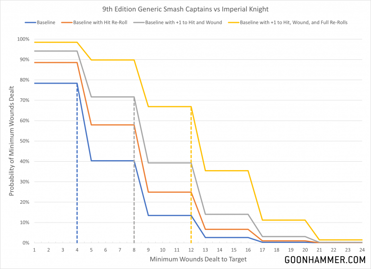 Chapter Master so that they can re-roll their own failed attacks. Outside of that there isn't much beyond what the model can get from their respective Chapters. Assuming you use the traits above, the end result will be six S9 attacks hitting on a 3+ at AP -2 while dealing 4 points of damage. Bonuses to hit and re-rolls can be sourced from a variety of things, but in general the performance of the Smash Captain will fall somewhere between the blue and yellow lines.