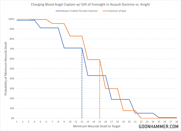 Hammer of Baal is interesting as it has no penalty to hit and a better AP. From the chart below we see that the D4 thunder hammer averages less damage than the Hammer of Baal, but has a higher chance of getting an extreme level of damage. Against opponents that reduce incoming damage like Blight Lord Terminators the bonus damage is likely a better choice.