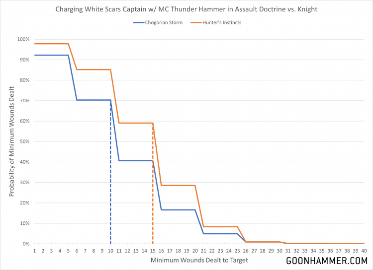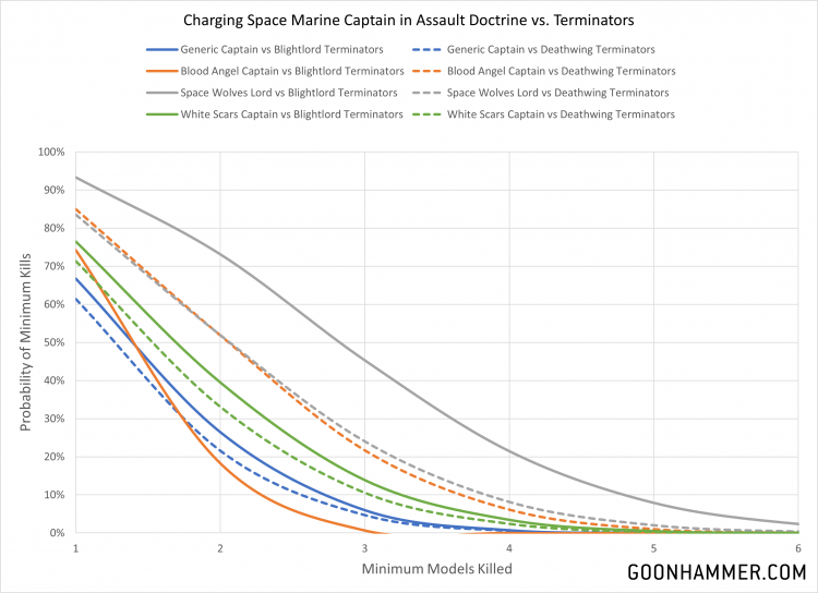 Death Guard Terminators has changed the nature of what constitutes a significant threat. A Smash Captain armed with a thunder hammer, storm shield, and jump pack, is 140; toss on Chapter Master and you're hitting 180 points. That's a significant investment, so how well does it perform against those kind of targets? For the chart below we looked at the generic captain and the three melee Chapters in the Assault Doctrine. As before the generic Captain will have