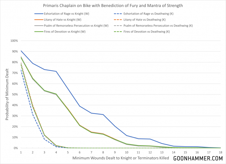 At first this seems like an error, but it makes sense when you consider what each Litany is doing. The model starts with six attacks. Litany of Hate allows for missed hits to be re-rolled, which in the case of a 2+ is a result of a 1. Psalm of Remorseless Persecution allows for wound rolls of 1 to be re-rolled. Since the Primaris Chaplain on Bike is dealing six attacks that means, on average, you're going to get one re-roll. That is effectively an extra attack, making it equivalent to the results from Fires of Devotion. The bonus from Exhortation of Rage doesn't apply to Deathwing Knights, so it kills fewer models.