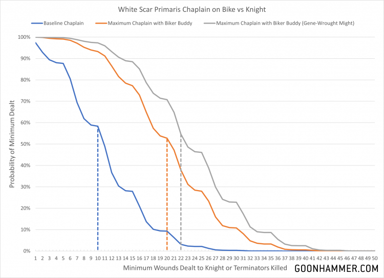 Now we're talking. Properly boosted the Biker Chaplain can pose a reasonable threat to even an Imperial Knight, although to do so would still require the first Chaplain to stay within 6" to ensure the re-rolls. Every strike that goes through deals 5 points of damage, making it roughly equivalent to a melta hit at half range. Using the Stratagem provided enough of boost to have a 45% chance of killing the Knight, which is fairly impressive given how much Games Workshop has focused on reducing high damage threats like this.