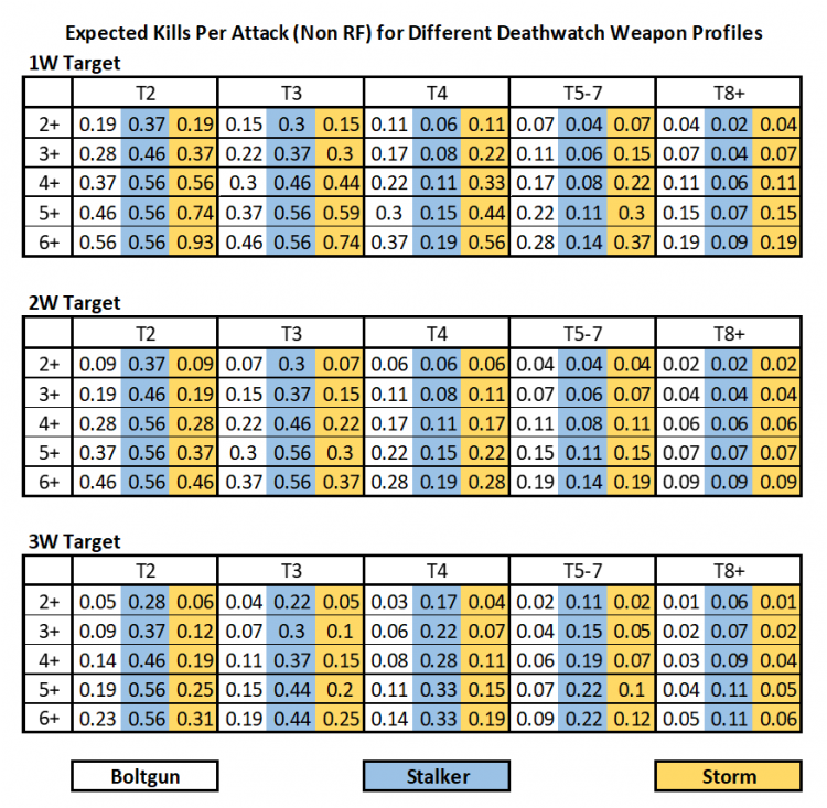 In 8th Edition the most effective choice for Deathwatch players was to take their Deathwatch Veterans and give them storm bolters and storm shields. This provided a brutal combination of lethality and defensive capability thanks to Rapid Fire 2 gun shooting Hellfire ammunition and a 3++. While storm shields are still great (aside from everyone else, who doesn't like 2W T4 models with a 2+/4++ profile?), should Deathwatch players whip out the green stuff and unceremoniously plug one of the barrels? In terms of output the storm bolter gets twice as many shots as the boltgun for only 2 points more. In terms of expected damage this means the output is identical to the boltgun if it were to fire vengeance rounds, only with the bonus of being equally applicable regardless of the Wounds characteristic of the target. The chart below compares the expected kills per attack for each weapon assuming the best possible ammunition. So for example vengeance ammunition is only used where relevant (such as equipping stalker-pattern boltguns with vengeance rounds when firing against 3W targets).