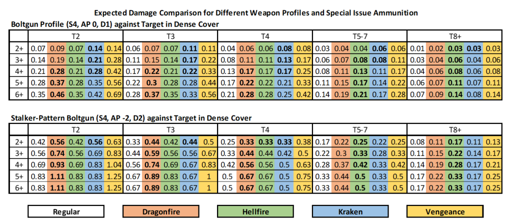 We immediately see that the additional point of damage from the vengeance ammunition makes it the superior choice outside of T8+ targets getting shot at by stalker-pattern boltguns. The