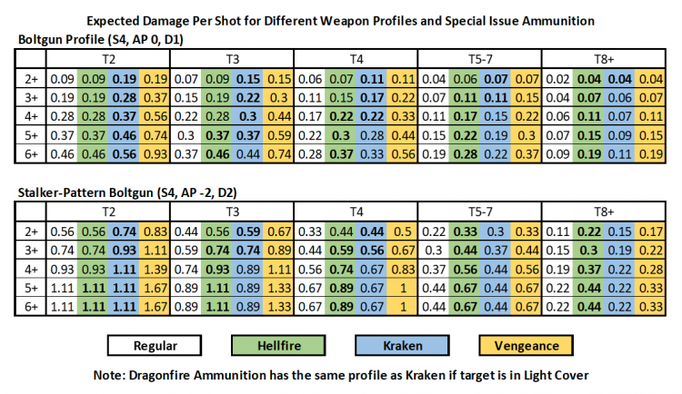 power of modifying the driving attributes of damage and the number of attacks is well understood and continues to be true in this case. The caveat here is that there are scenarios where the additional point of damage is useless; specifically when the Wounds characteristic of the target is equal to or less than the damage dealt by the baseline weapon. In those situations the preferred choice of ammunition depends on the toughness and armor save of the target. In general there is a balance point for a given combination of Toughness characteristic and Save where kraken and hellfire are equally effective; for saves below that point kraken is preferable while above that point hellfire is preferable. Note that this is damage per shot, so in scenarios where the additional range of kraken gets the boltgun into rapid fire range then that would be the ideal choice.