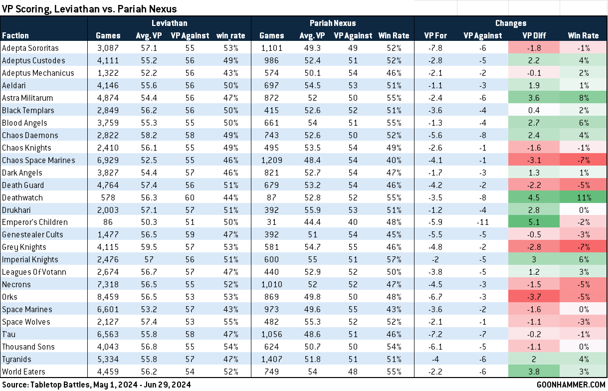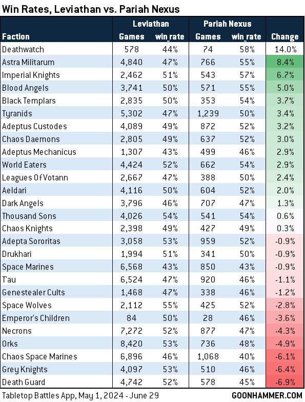 Big changes to points and rules mean big changes to win rates. Let's take a look at how win rates changed from Leviathan in May to Pariah Nexus in June:
