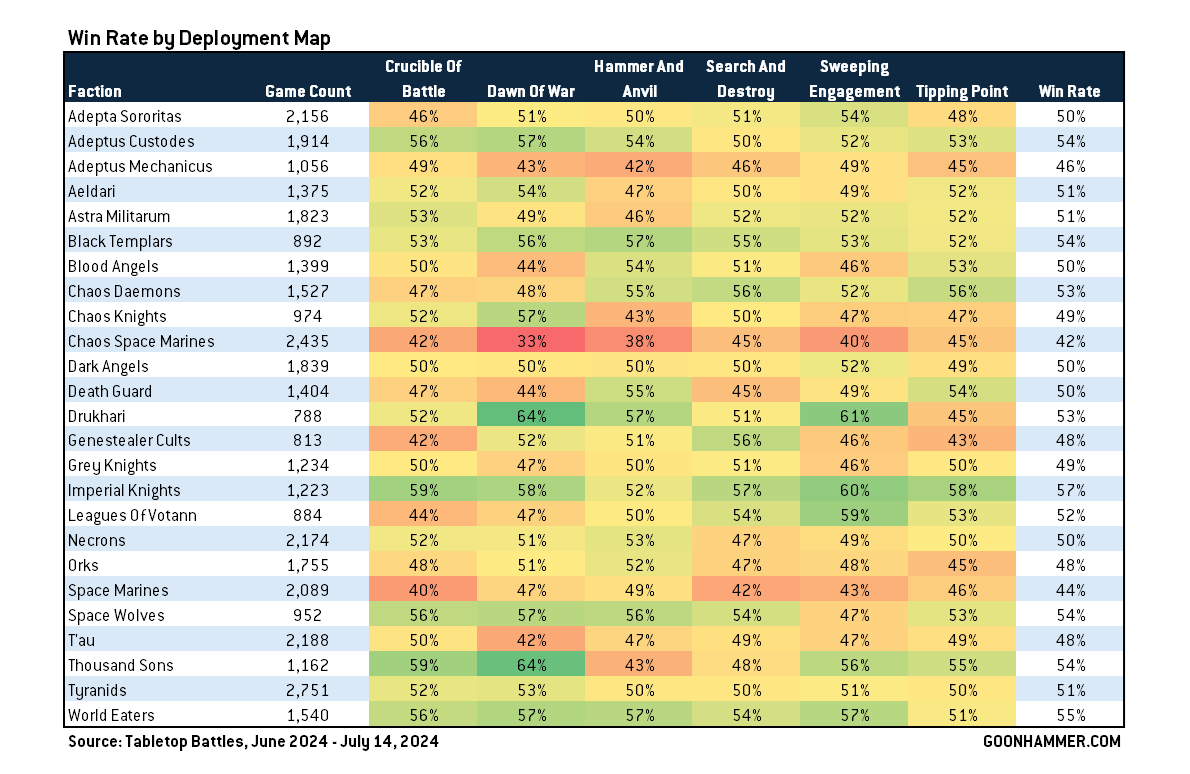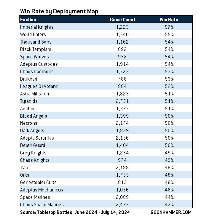 There's a lot there and it's hard to spot real trends - it's also worth noting that while all of these cuts generally have more than one hundred games behind them, they're much smaller and more volatile than we'd usually see. I have no idea why Chaos Space Marines just seem to eat shit on Dawn of War, but melee-focused armies like Daemons, Black Templars, World Eaters, and Space Wolves seem to really like Search and Destroy and Sweeping Engagement, and Imperial Knights and Votann seem to do well on those as well.