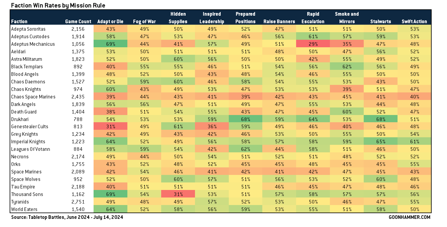 Next up let's look at the mission rule. There are a lot of these to consider - ten in total - and as with Deployment Map I'm going to sidestep some of the harder questions by just dumping the data here and then talking trends afterward. As with deployment map, these totals are a bit smaller and so more volatile, and some of these faction/mission rule combinations absolutely have fewer than one hundred games.