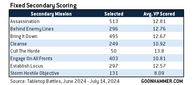 There are 18 Secondary Missions in the Pariah Nexus deck, and of these eight can be selected as Fixed options (Recover Assets was removed as an option in the Tournament Companion. Players score an average of 22.7 VP on secondary per game and choose Fixed Secondary missions around 12% of the time in Pariah Nexus.