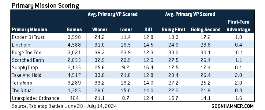 Next up let's look at primary missions. There are nine Primary Missions to choose from in Pariah Nexus, and for these we're mostly interested in looking at broad scoring and whether any missions are more likely to create blowouts or a first-turn advantage.