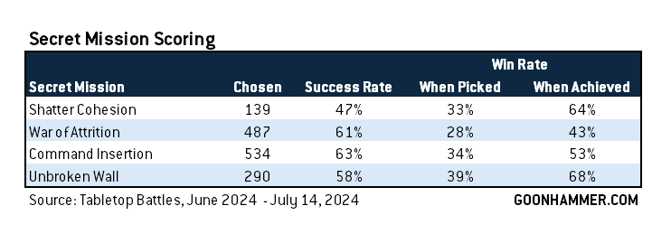 So Secret Missions have around a 55% success rate when you take them, and if you can pull one off, your odds of pulling off a win are pretty good. Well, unless you took War of Attrition, it seems. There are some fun additional stats in here - about half the time players achieve secret missions they still lose, and about 6% of the time players take a Secret Mission and fail to achieve it they win the game anyways. Hat's off to those absolute Chads.