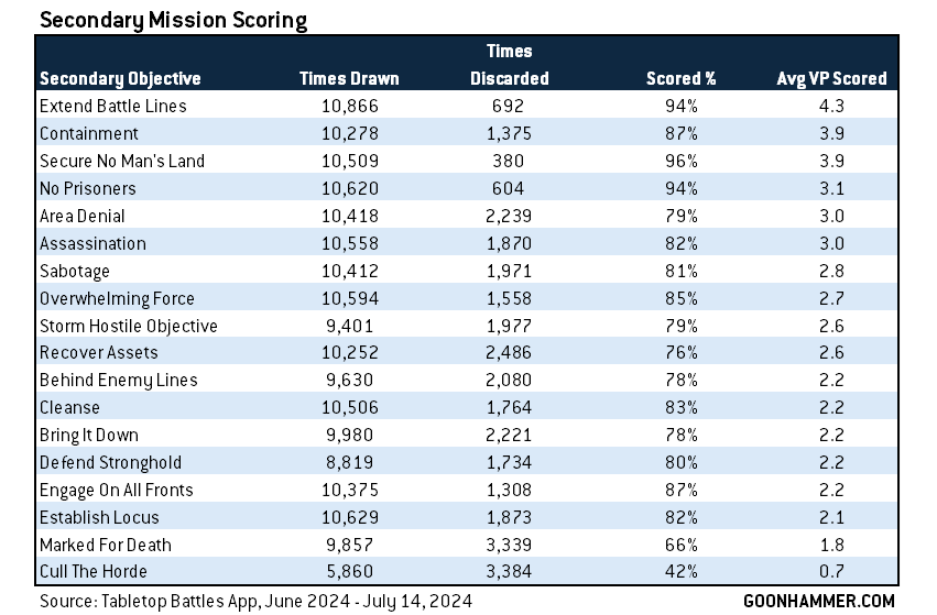 At the bottom of the list is Cull the Horde - unscorable in most games and discarded, and extremely hard to score otherwise, and my new vote for "Worst Secondary Mission in the game," Marked for Death, which is scored only 66% of the time, the second-lowest of any secondary mission by a considerable margin.