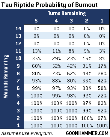 The Riptide is an extremely powerful unit that enjoys a nasty combination of mobility, toughness, and lethality. This is further enhanced courtesy of its Nova Reactor ability, which when activated can either enable the model to ignore wounds on a 5+, move 2D6" in the Charge phase as a Normal Move, or increase the number of shots of its main weapon by 33%. This bonus comes at a price; every time the nova reactor is activated the player must roll equal to or less than the number of remaining wounds or the reactor is burned out and cannot be used again. This can be mitigated by the Branched Nova Charge Stratagem for 2CP, but that can only be used once per unit. So how likely is it that you will burn out?