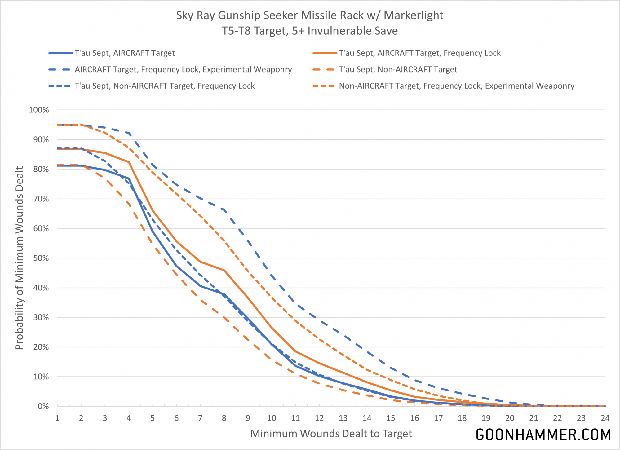 With the new markerlight rules you will generally be hitting on a 3+, and thanks to the new Targeting Array ability a failed hit roll can be re-rolled. Assuming you use the T'au Sept then the Coordinated Fire Arcs sept tenet means the wound roll can also be re-rolled. In a dramatic shift the weapon now ignores nearly any save possible, leaving you with one of the flattest and most reliable damage curves in Warhammer 40k. 145 points will buy you a platform which potentially has a 79% chance to deal 10 wounds to anything, and against T7 or lower that probability increases to 86%. Longstrike sits at a flat 95% courtest of the +1 to wound from the Gunship Ace ability assuming the target is a MONSTER or VEHICLE, and can provide a neighboring CORE or HAMMERHEAD unit with a Markerlight token courtesy of his XV02 Pilot Battlesuit. Not bad for 160 points.