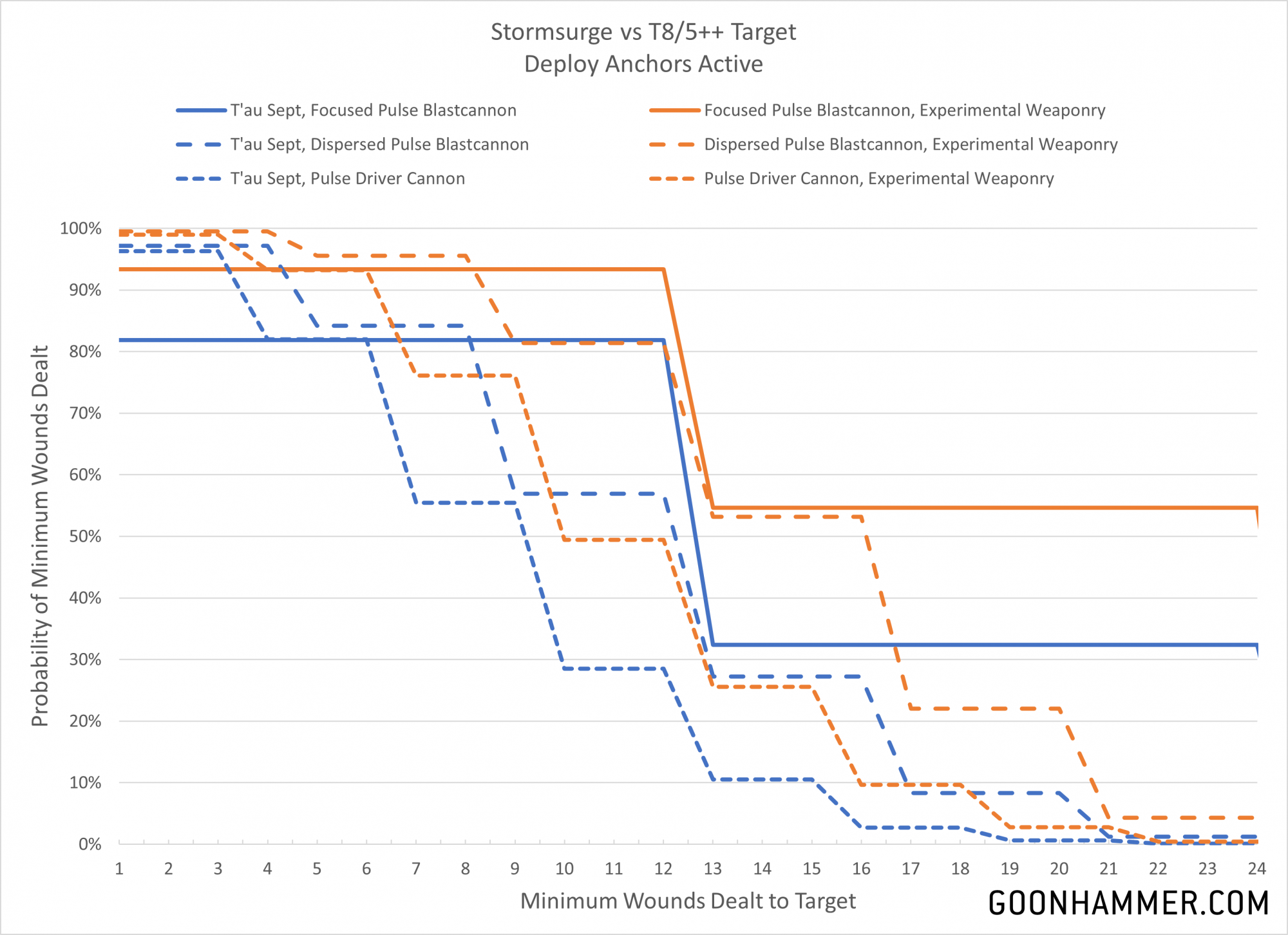 Yes, the chart below does show that a Bor'Kan Stormsurge firing with Experimental Weaponry active has a better than even chance of one-shotting a Knight. Depending on the wound value of your target both the dispersed shot and the pulsed driver cannon have a role to play against heavy infantry, with the pulse driver cannon having a significant advantage against bigger units.