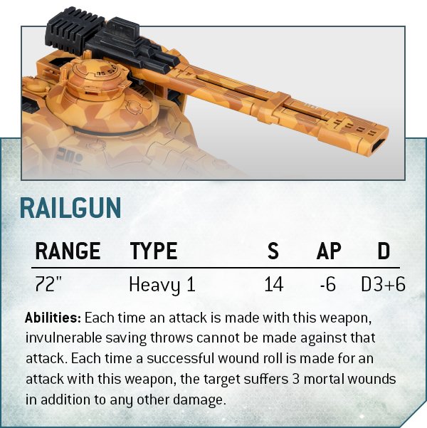 The Hammerhead's railgun is a perfect example of how things have changed for the T'au. Previously this weapon was S10, AP -4, and dealt D6 damage with a chance to inflict D3 mortal wounds on a wound roll of 6+. With enough markerlights on the target you had a roughly 52% chance of wounding high value targets, but assuming the target didn't save you were still relying on a D6 damage profile to do anything of value. On a single shot weapon this is simply not viable. Fortunately GW seem to have addressed this, and the new profile is significantly nastier.