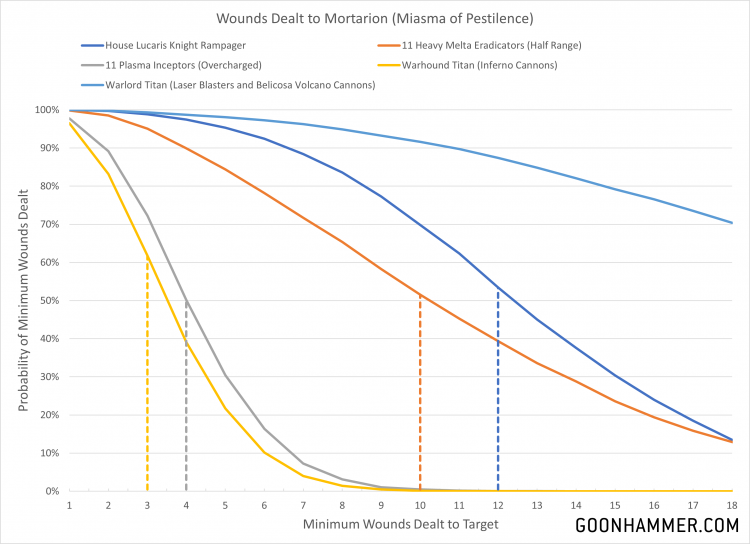 First up we see that, in a single turn, it's extremely hard to kill Mortarion outside of using a full attack from a 5500 point ambulatory manifestation of the Omnissiah's unbridled wrath... and even then 30% of the time the Primarch survives. Of the more likely threats only the House Lucaris Knight Rampager and the Eradicators armed with heavy meltas have any chance of killing him in a single turn. The combination of damage reduction, ignoring wounds, high toughness, and impressive invulnerable save synergize into a nightmare of a threat. Things can be slightly improved through the use of re-roll auras and other effects (assuming Mortarion hasn't been able to turn them off!), but the bottom line is that Mortarion is everything he should be.