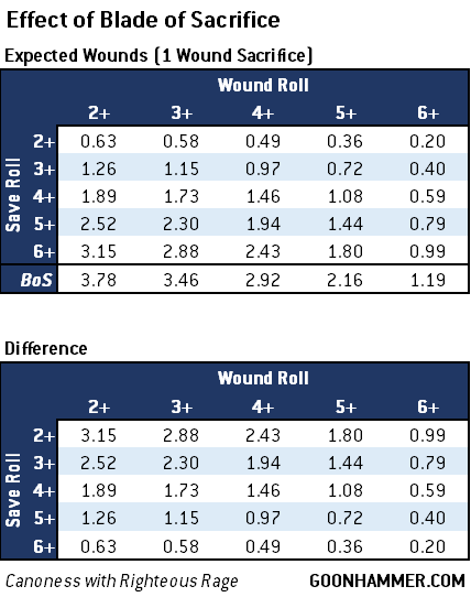 Righteous Rage trait to re-roll hits and wounds to maximize the impact of the sacrifice. Because we're dealing with a wide variety of options we'll use an expected wounds approach, or simply the average amount of damage we can expect to be inflicted on the target. Both the wound roll and save roll values are after modifiers, and the effect of the Blade of Sacrifice is identical to the target not receiving a save at all. For a two wound sacrifice the expected wounds would double, and if the The Passion Sacred Rite is active then the expected wounds are multiplied by 1.16.