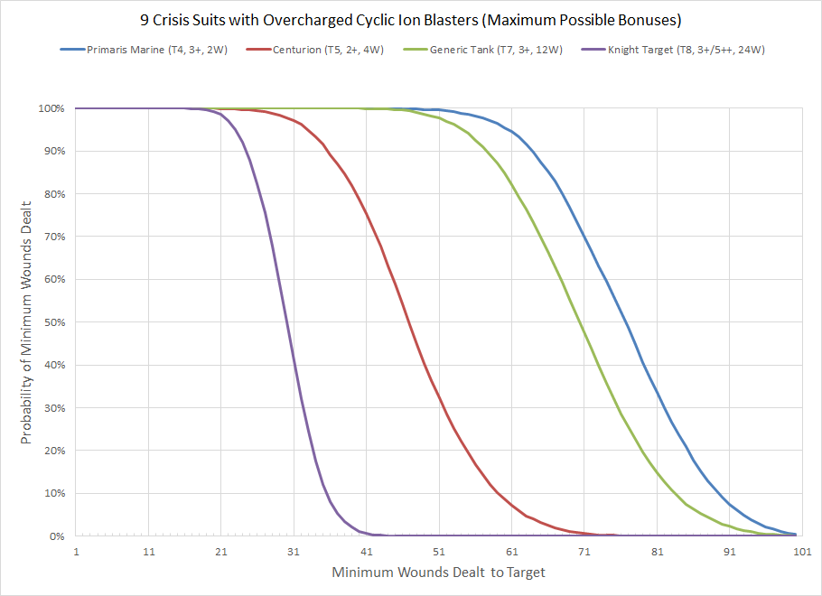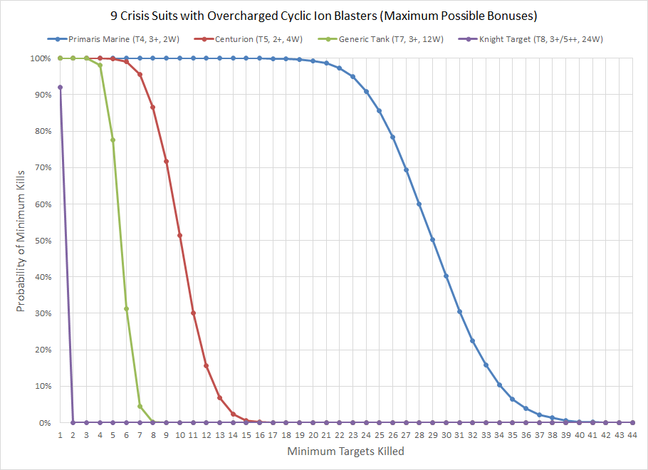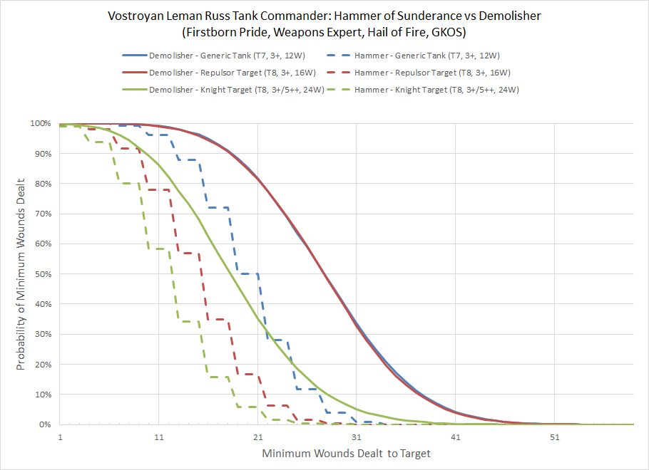 There is some overlap between the wound curves as the demolisher wounds the T7 and T8 targets the same. I think the Vostroyan Tank Commander with a demolisher could be a potentially devastating addition to any Imperial army, and as a long time fan of this weapon I'm glad to see it finally produce the level of fear it so richly deserves. Across the board we see the potential for mayhem caused by the effect of 12 shots that are extremely likely to all hit. Even the Knight isn't safe, with a single Tank Commander potentially getting a one turn kill 22% of the time. The threat range is also significant, thanks to the Vostroyan