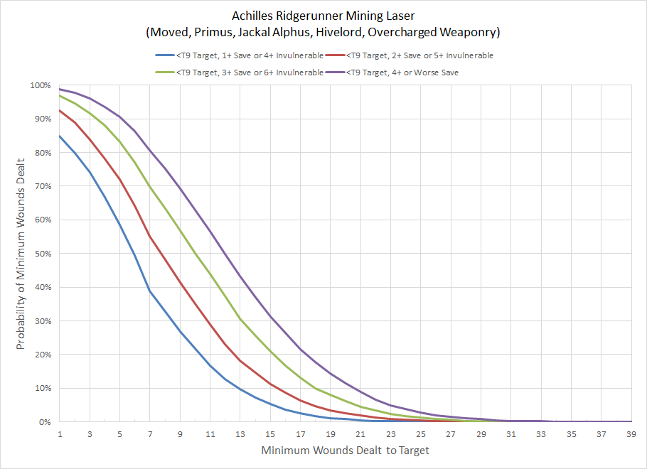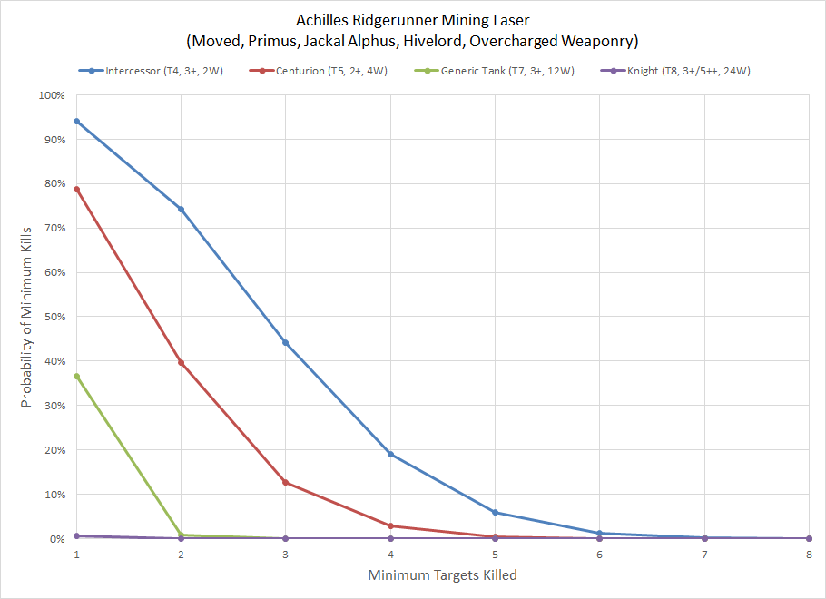 Even with the Jackal bonus to off-set the movement penalty and extensive re-rolls provided by the Primus Warlord, the results will degrade something like a Repulsor but probably won't kill it. The problem is that while the wound roll is practically guaranteed the hit roll is still a 4+ that re-rolls 1s (around a 58% hit chance), and both the number of attacks and the damage rolls (the two gateway values which have the greatest impact on the outcome) are highly variable. Below you can see how the mining laser performs against various units and how many they'll likely kill.